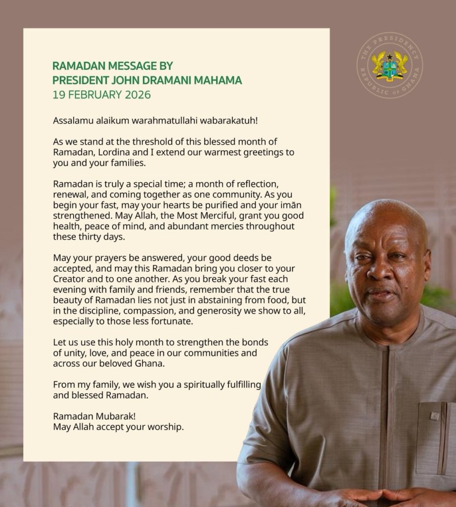 In concluding his Ramadan message, President Mahama stated, “From my family, we wish you a spiritually rewarding and blessed Ramadan. Ramadan Mubarak! May Allah accept your worship.”