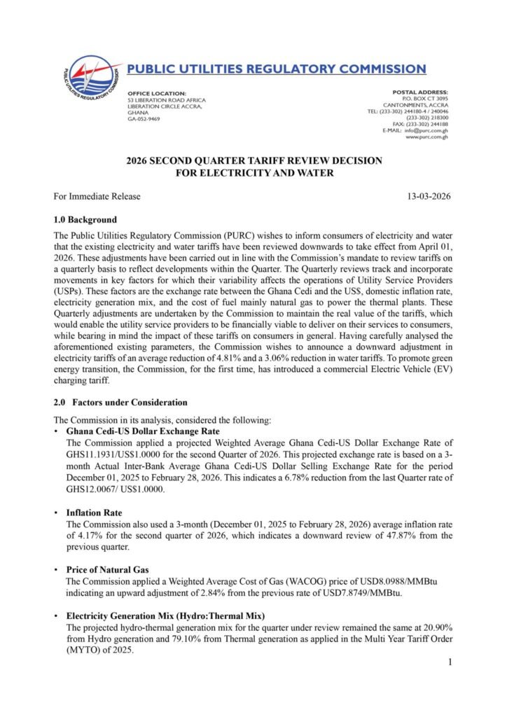 The Public Utilities Regulatory Commission has announced a reduction in utility tariffs for the second quarter of 2026.