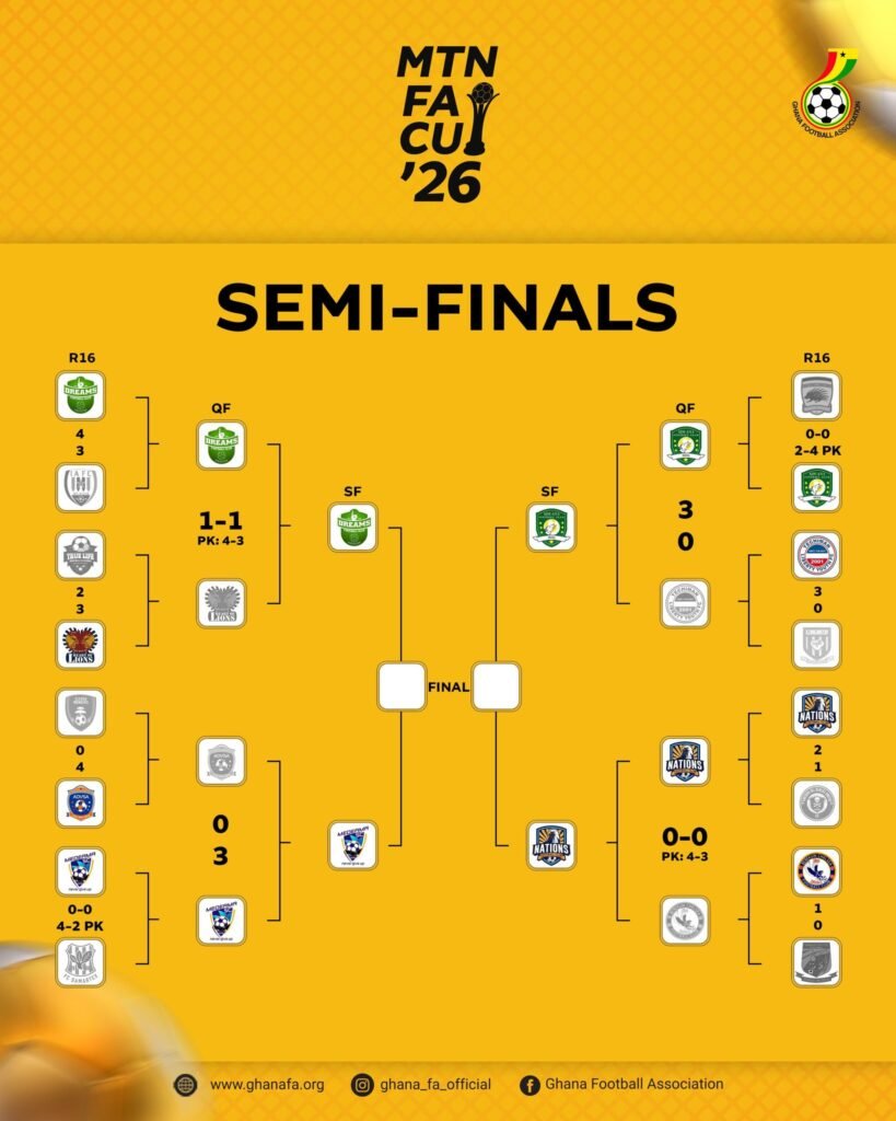 The semifinal lineup for the 2025/26 Ghana FA Cup has been officially confirmed following the conclusion of the quarterfinal matches over the weekend.