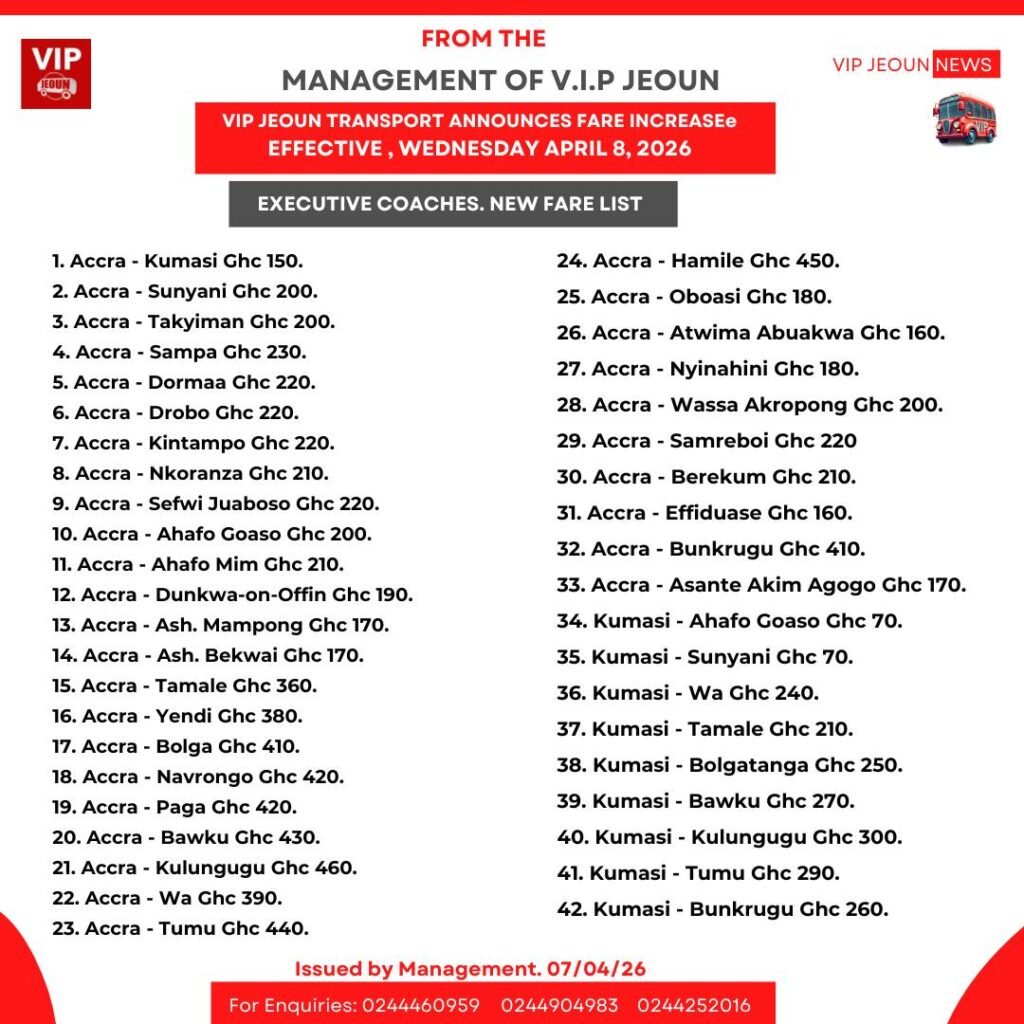 VIP Jeoun Transport has announced a significant fare increase for both its executive coach and standard tour services, effective Wednesday, April 8, 2026.