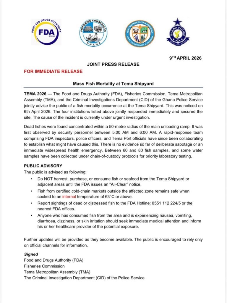 “As a precaution, the public is advised to avoid consuming any fish or seafood sourced from the Tema Shipyard and its surrounding waters until further notice. However, fish obtained from certified cold-chain markets outside the affected area remain safe if properly handled and prepared,” the statement said.
