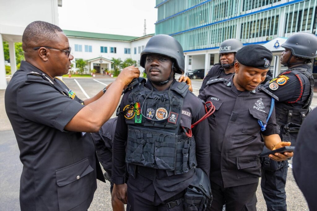 The officers, from the Tema Regional Police Command, were elevated to higher ranks following their response to a robbery attack on a mobile money vendor at Tema Community 5. The operation led to the shooting of two suspected robbers and the recovery of a firearm, ammunition, and other exhibits.