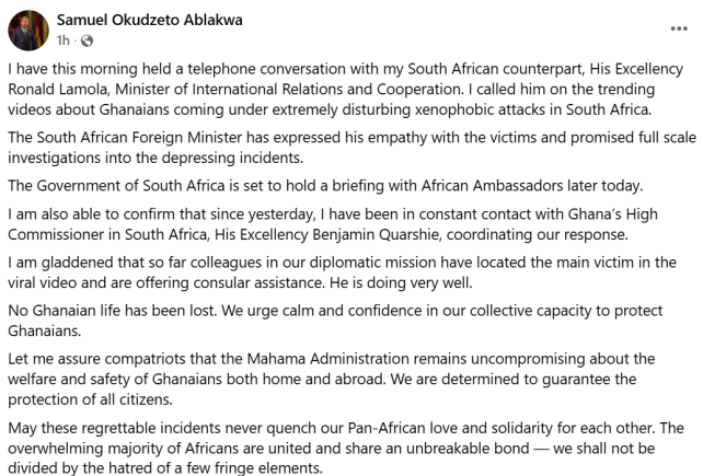 The Minister for Foreign Affairs, Samuel Okudzeto Ablakwa, confirmed that he held a telephone conversation on Wednesday with his South African counterpart, Ronald Lamola, to address the situation and coordinate an appropriate response.